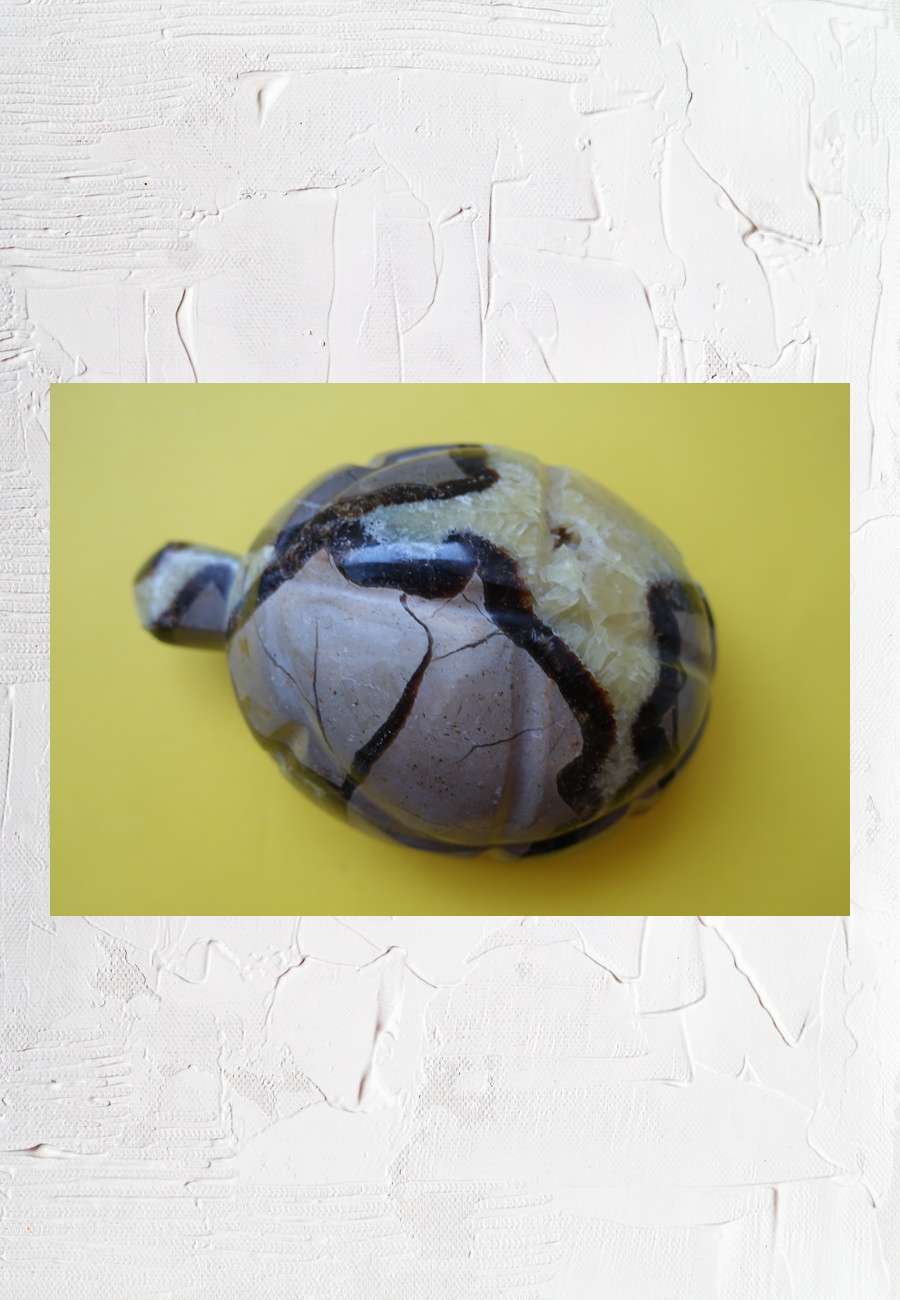 Solide Bildhauerarbeit, der Naturstein mit kristallinen Einschlüssen heißt Septaria (versteinertes Holz, ca. 150 Millionen Jahre alt), aus Madagaskar, poliert, Größe 16 cm. Die Zusammensetzung besteht aus gelbem Calcit, braunem Aragonit und grauem Kalkstein.Die faszinierende Maserung eignet sich ausgezeichnet für einen Schildkrötenpanzer. Das Objekt wurde auf der Mineralienmesse München entdeckt, der Händler I. Vely kommt aus Charleville-Mézières, Hauptort des französischen Departements Ardennes.