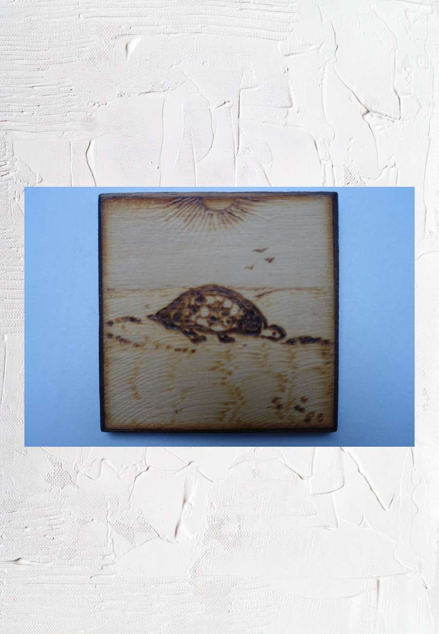 Eines der kleinsten "Gemälde" auf Holz, Brandmalerei, Größe 5 x 5 cm, Motiv: eine einsam wandernde Schildkröte, über ihr nur 3 Vögel und eine strahlende Sonne - schlicht und dennoch eindrücklich.