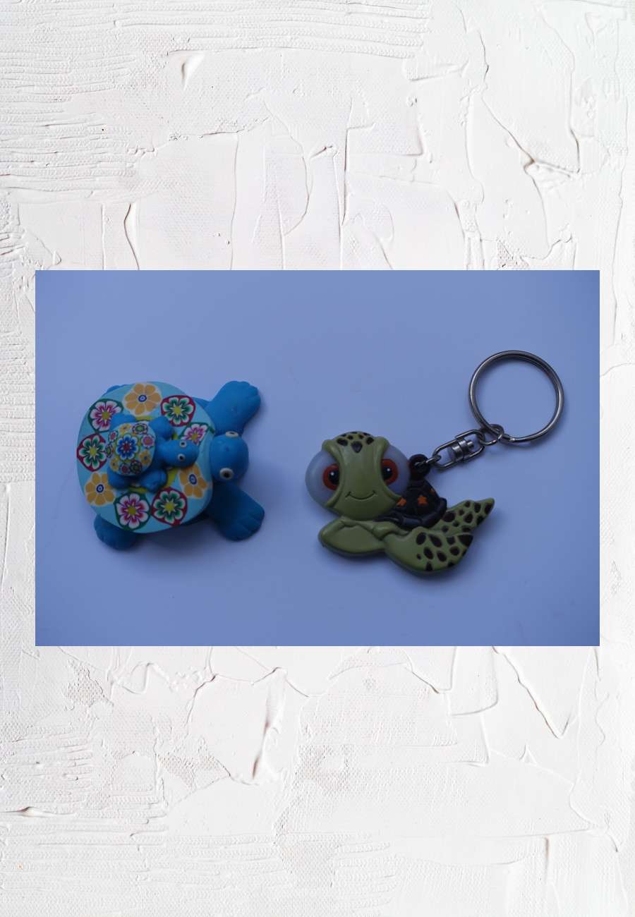 Das linke Stück kommt aus China, kautschukartig, bemalt, mit zwei kleinen Magneten im Boden, Größe 5,5 cm. Das Gegenstück ist ein blinkender Schlüsselanhänger