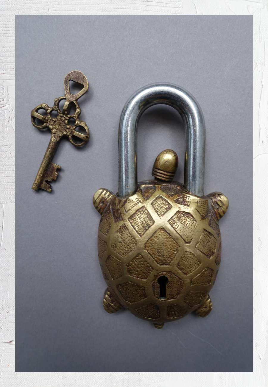 Solid curtain lock, brass with steel shackle, lock in the movable head, approx. 13 cm. Plant ornaments and Nepalese characters are embossed on the floor.