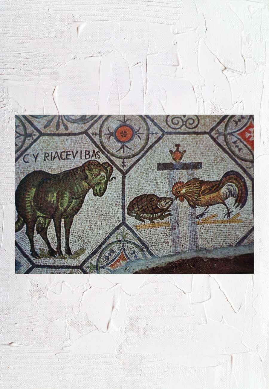 The magnificent floor mosaic in the crypt of the Basilica in Aquileia from the IVth century shows, among other things, the fight between the rooster (symbol of light/day) and the turtle